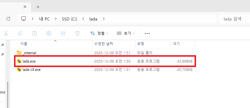 ▲ 압축해제 후 [lada.exe] 파일을 실행합니다.