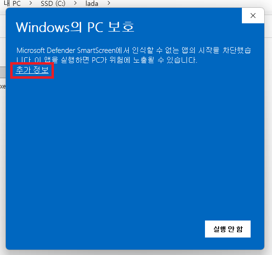 ▲ Windows의 PC 보호 창이 나타나면, [추가 정보 – 실행]을 클릭합니다.