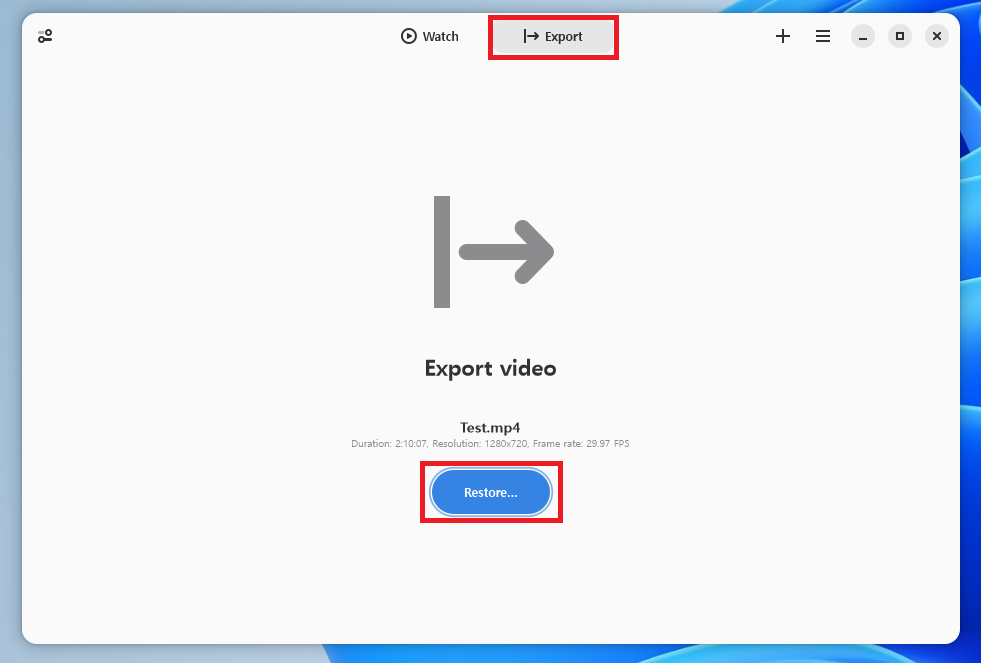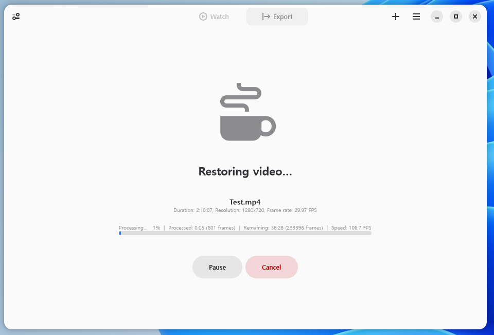 ▲ Watch 부분에서는 모자이크 제거된 영상을 실시간으로 확인할 수 있고 모자이크 제거 파일로 저장하기 위해서는 Export 부분으로 이동 후 [Restore]를 클릭합니다.
