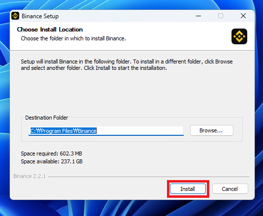 ▲ 바이낸스 설치 위치 선택창에서는 [Install]을 클릭합니다.