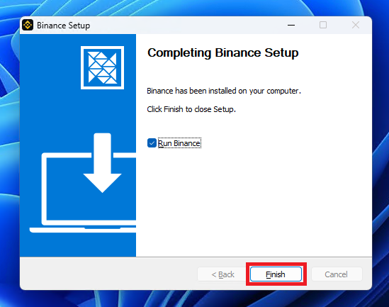 ▲ 바이낸스 PC 버전 설치가 완료되면, [Finish]를 클릭하여 설치 프로그램을 닫아줍니다.