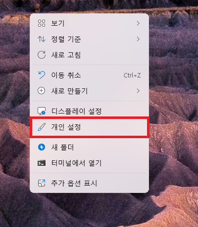 ▲ 바탕화면에서 [마우스 우 클릭 – 개인 설정]을 클릭합니다.