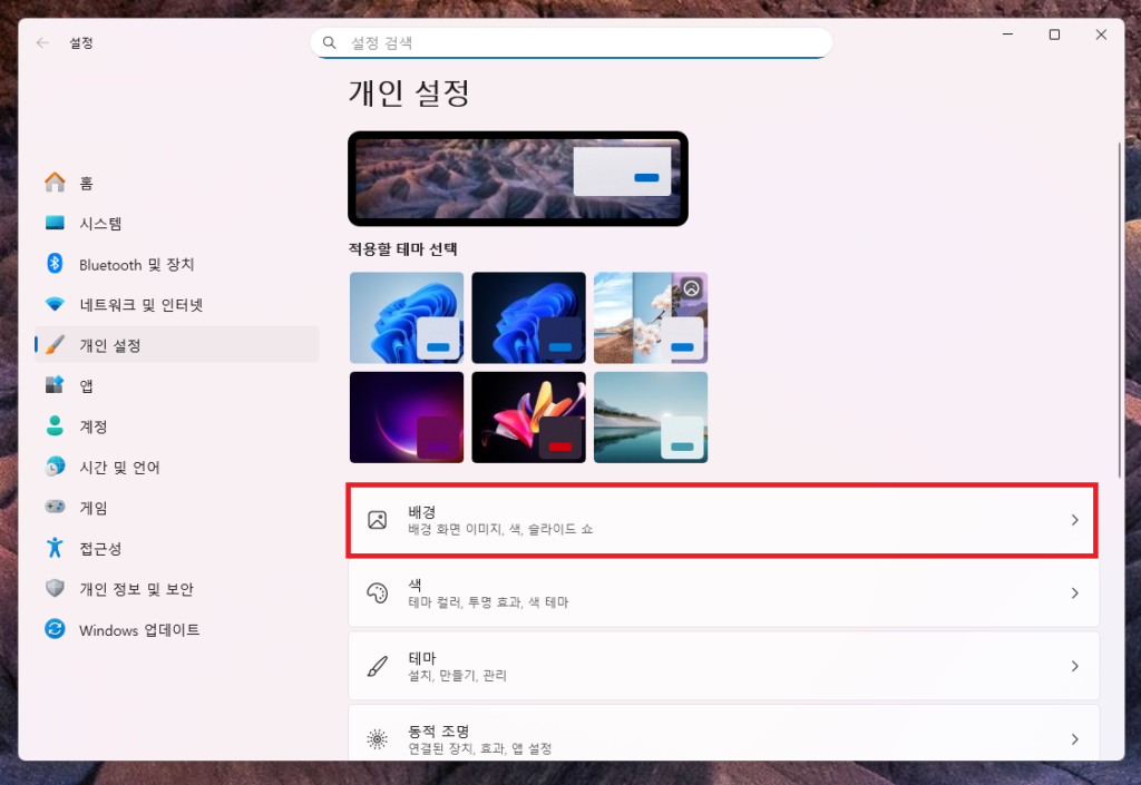 ▲ 개인 설정 창이 열리면, [배경] 항목을 클릭합니다.