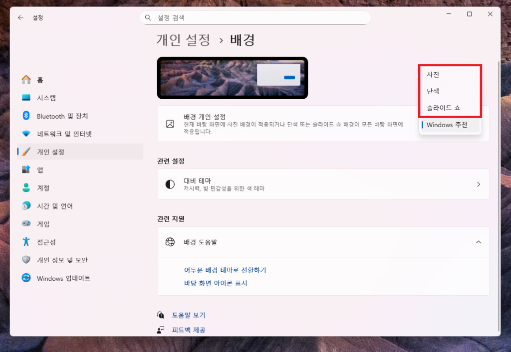 ▲ 배경 개인 설정에서 [사진, 단색] 항목을 여러번 변경합니다.