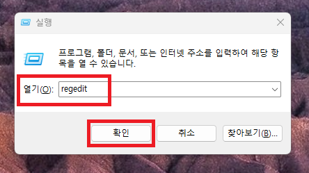 윈도우 실행창이 열리면, [regedit] 명령어를 입력 후 [확인]을 클릭합니다.