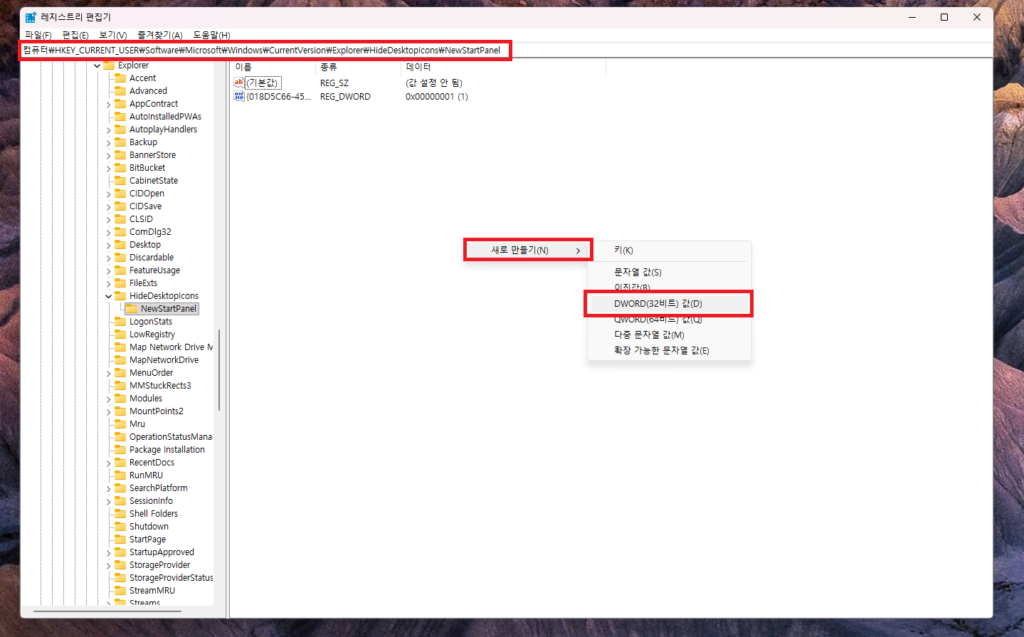 [컴퓨터\HKEY_CURRENT_USER\Software\Microsoft\Windows\CurrentVersion\Explorer\HideDesktopIcons\NewStartPanel]
