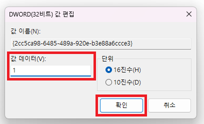 ▲ DWORD 값 편집창이 나타나면, 값 데이터를 [1]으로 변경 후 [확인]을 클릭해주시면 됩니다.