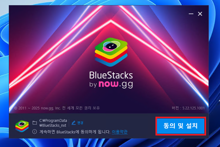 ▲ 블루스택 설치 프로그램을 실행 후 설치를 위해 [동의 및 설치]를 클릭합니다.