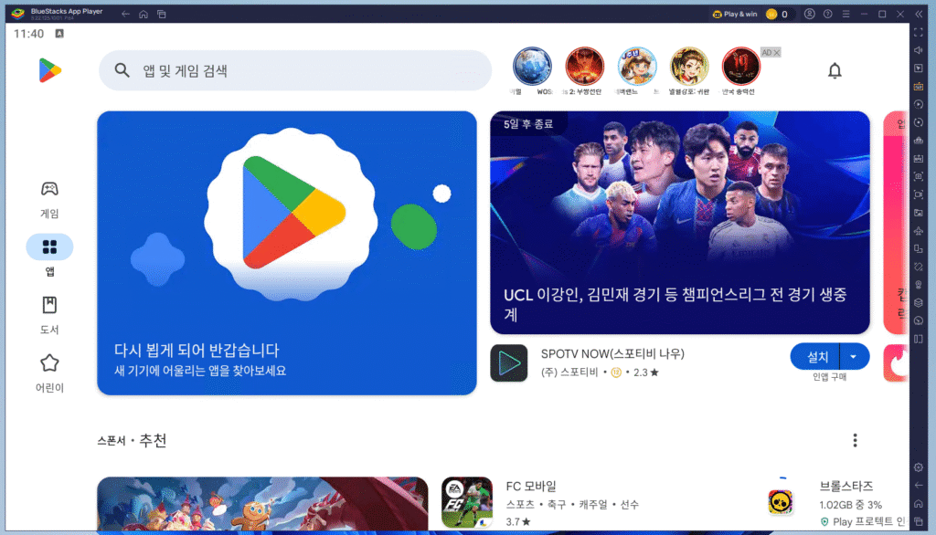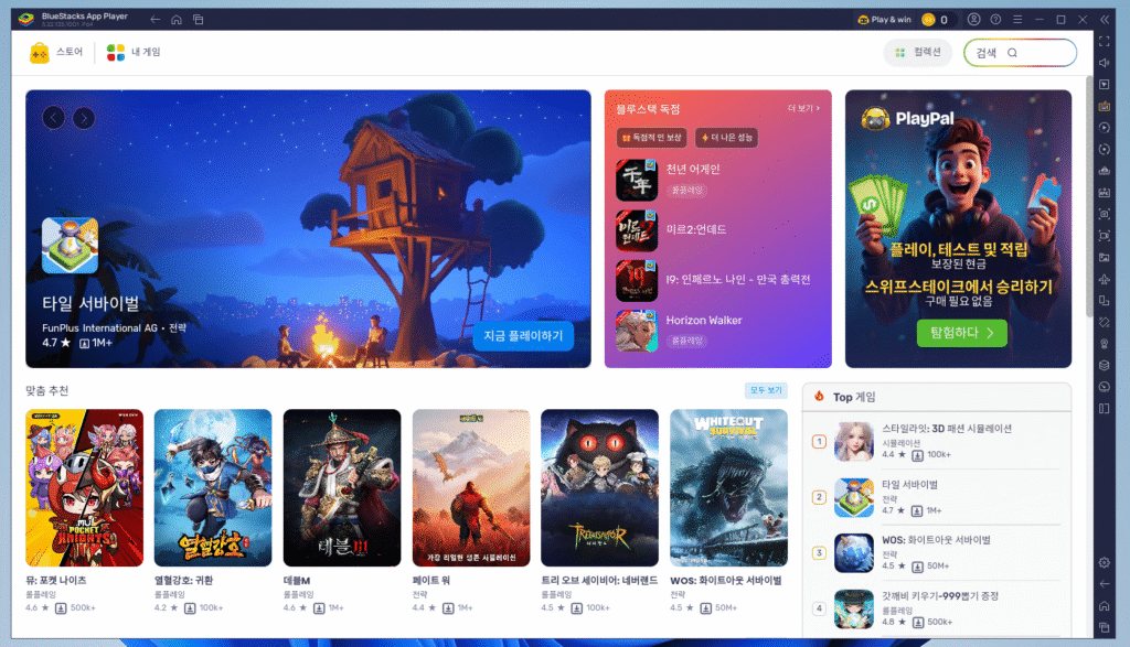 블루스택 스토어에서 원하는 모바일 게임 앱을 다운로드 및 설치할 수 있습니다.