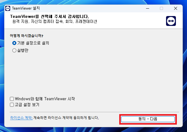 ▲ 팀뷰어 설치 프로그램 실행 후 [기본 설정으로 설치]를 선택 후 [동의 – 다음]을 클릭합니다.