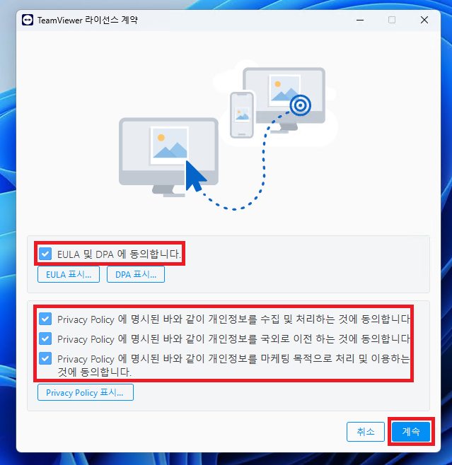 EULA 및 DPA 동의, Privacy Policy 등 동의에 체크 후 [계속]을 클릭합니다.