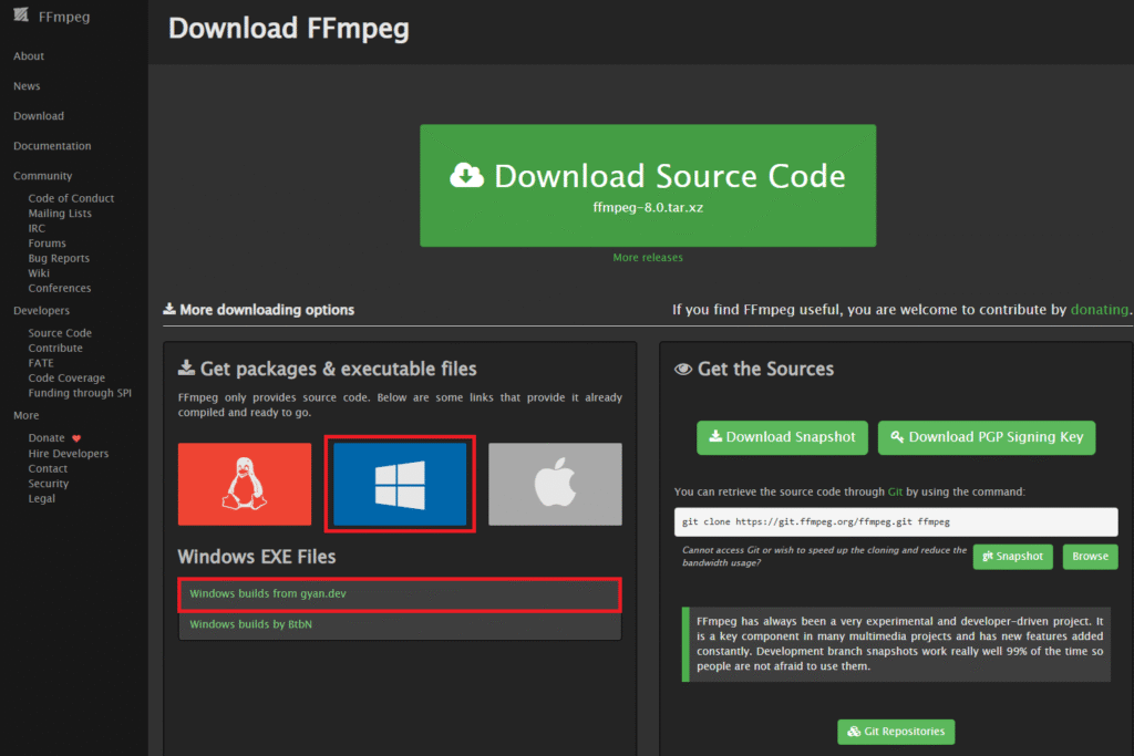 ▲ 하단에 있는 링크를 통하여, ffmpeg 다운로드 페이지로 이동합니다.
