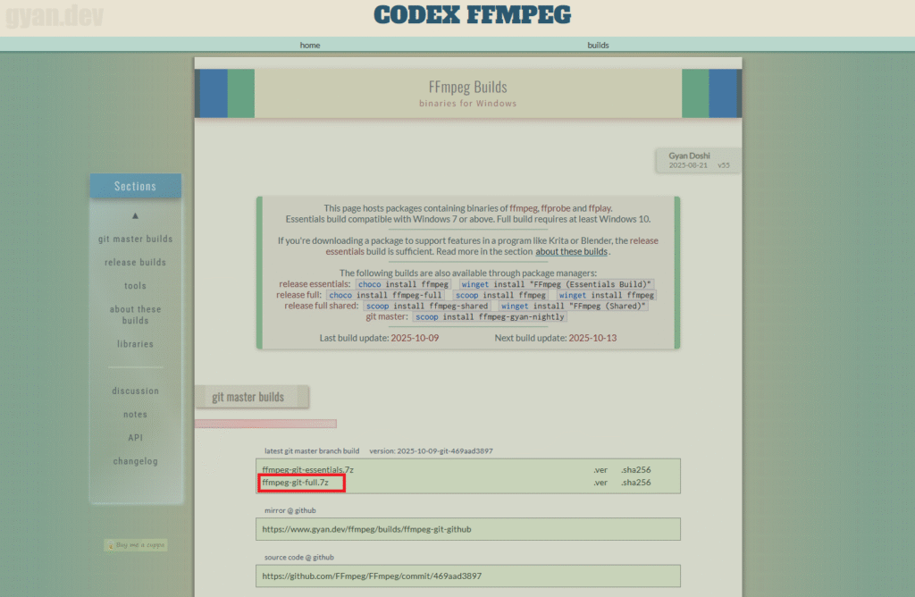 CODEX FFMPEG 페이지 이동 후 [ffmpeg-git-full.7z]를 클릭하여 ffmpeg 압축 파일을 다운로드 후 압축을 해제합니다.