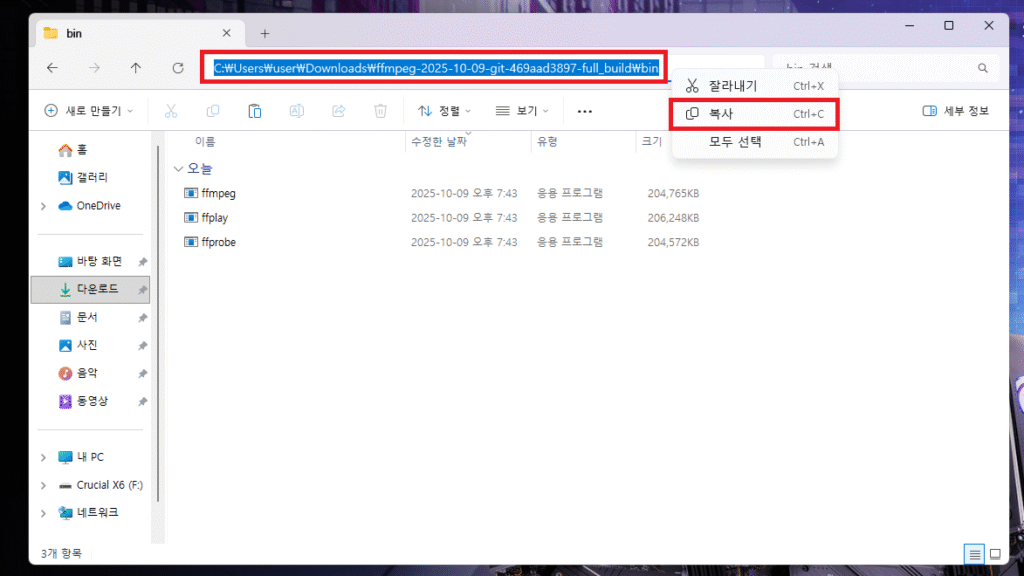 ▲ ffmpeg-git-full.7z 파일 압축해제 후 압축을 해제한 ffmpeg-git-full.7z 폴더내에 있는 bin 폴더의 경로를 복사합니다.