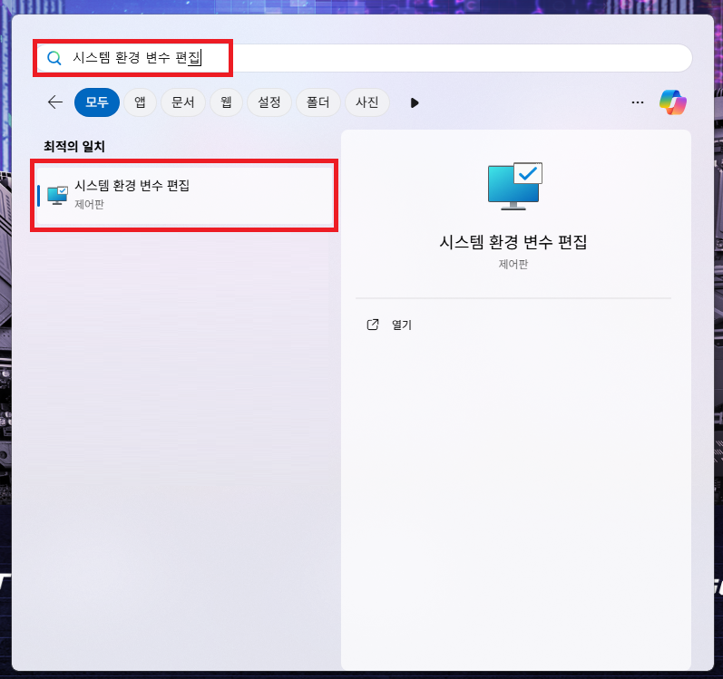 ▲ [윈도우키 + Q] 단축키를 사용하여 윈도우 검색창을 열어주신 후 [시스템 환경 변수 편집]을 검색 후 클릭합니다.