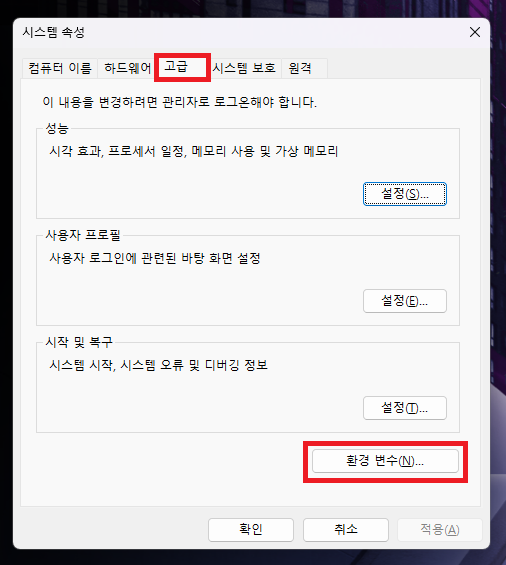 ▲ 그럼 위와 같이 시스템 속성창이 나타납니다.