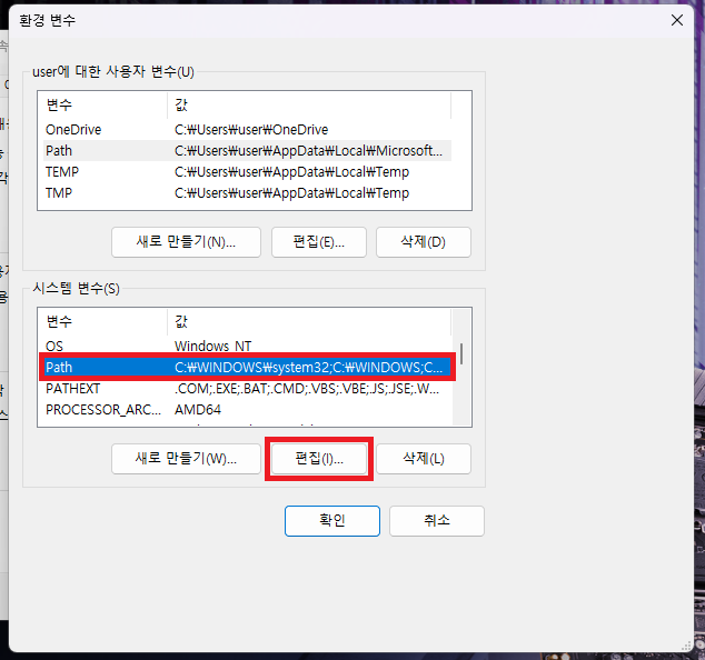 ▲ 환경 변수 창이 나타나면, 시스템 변수 부분에 있는 [Path]를 선택 후 [편집]을 클릭합니다.