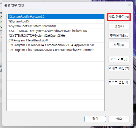 ▲ 환경 변수 편집창이 나타나면, [새로 만들기]를 클릭합니다.