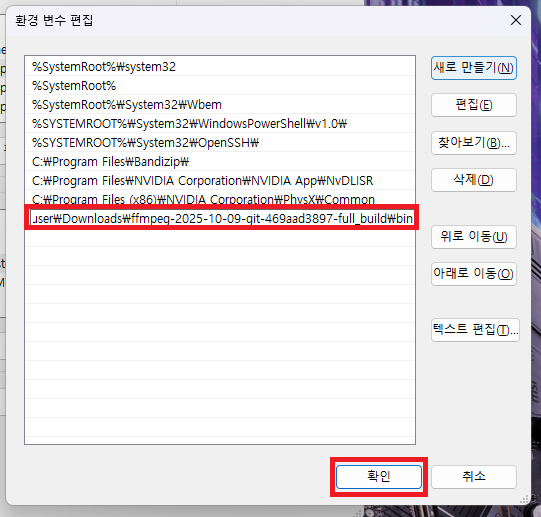 ▲ 새로 만들기 클릭 후 위에서 복사한 ffmpeg bin 폴더 경로를 붙여넣어주신 후 [확인]을 클릭하시면 ffmpeg 설치가 완료됩니다.