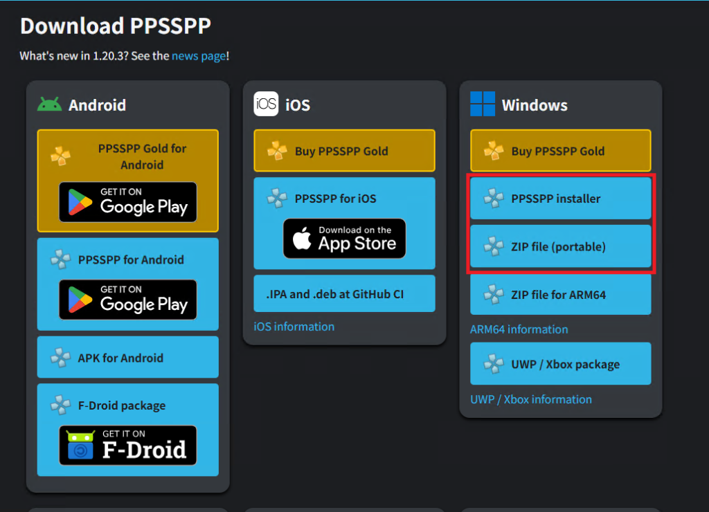 ▲ Download PPSSPP 페이지로 이동 후 Windows 부분에서 [PPSSPP installer] 혹은 [Zip file (portable)]을 클릭하여 PPSSPP를 다운로드 합니다.